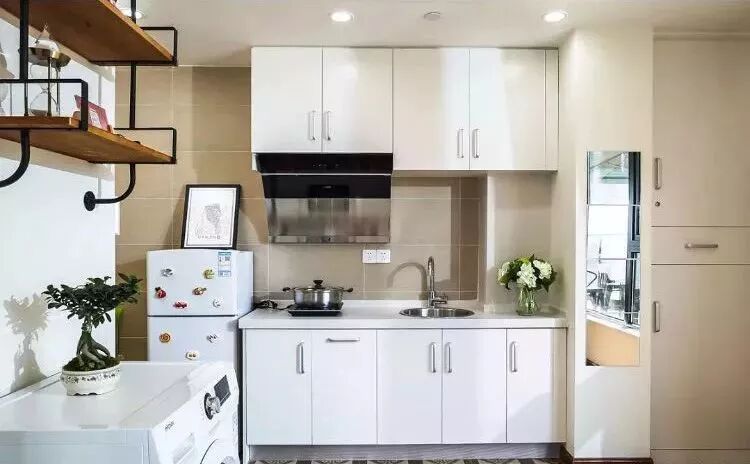 如果厨房属于面积狭小的狭长型,建议使用一字型布局。可以在角落留出一个冰箱的尺寸,将冰箱和橱柜融合。担心收纳性能较弱的话,可以多做墙柜哦。