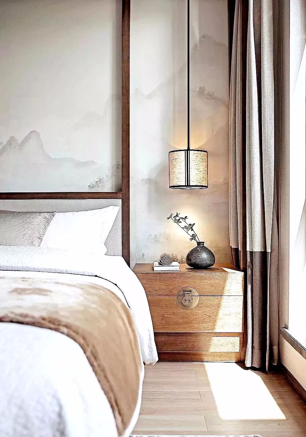 在新中式风格的家装设计中,卧室背景墙的呈现更是大气优雅,令人着迷。