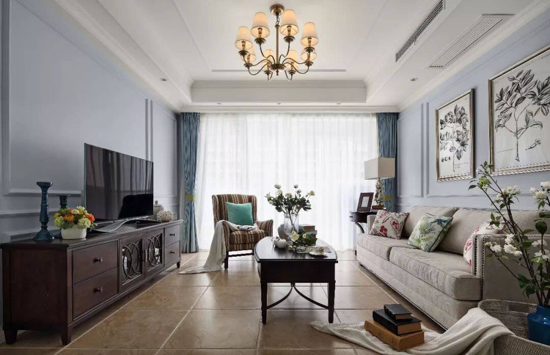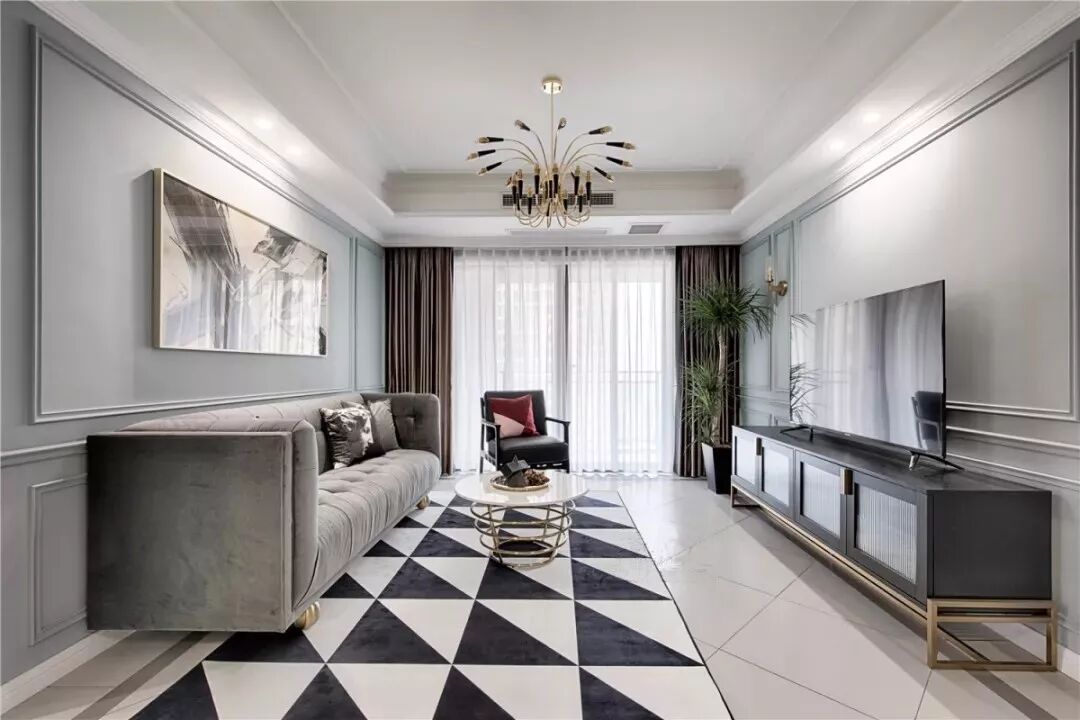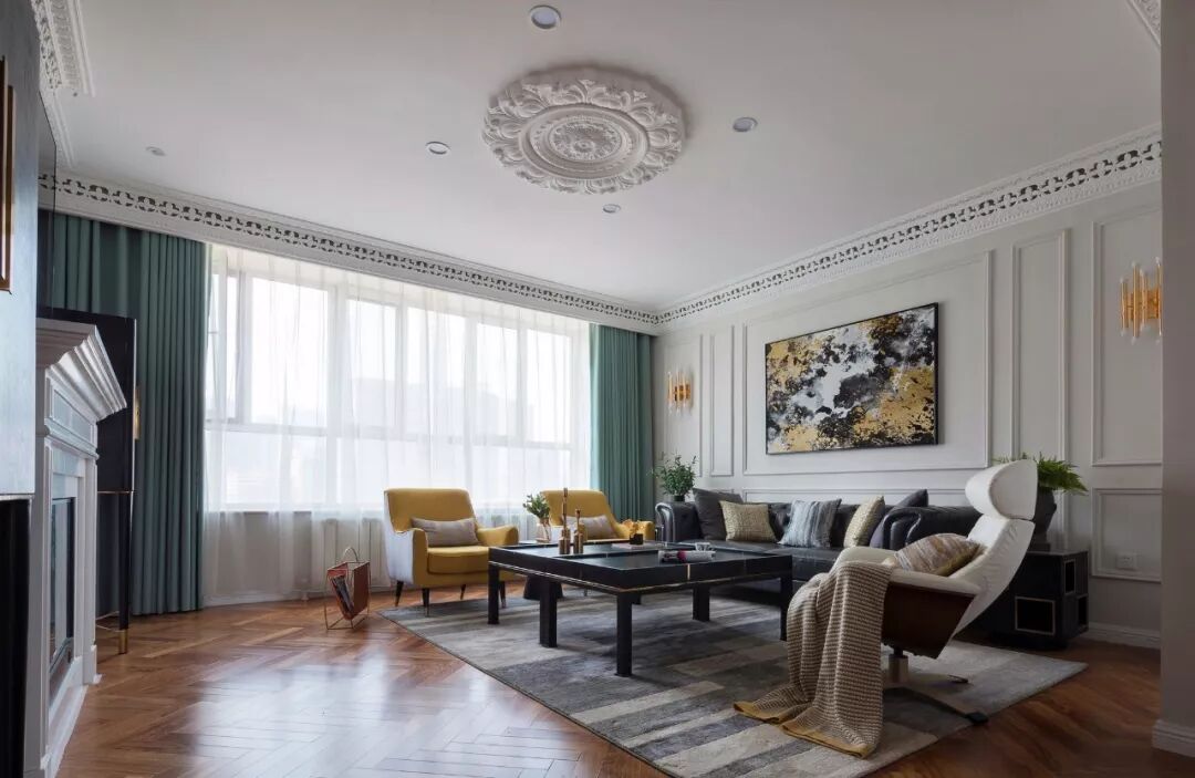 沙发墙与电视墙类似,通过加入边框线条来划分沙发墙的沙发、边几摆放位置,同时挂画的布置也可以结合整个墙面的边框造型来设计,这样让空间显得更有层次与档次感。