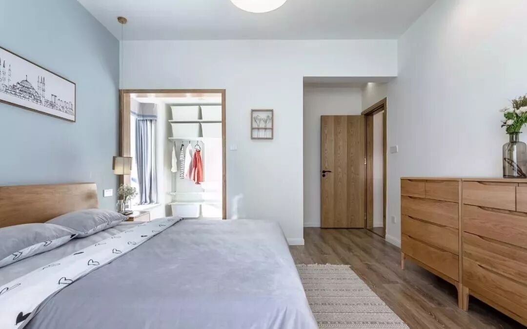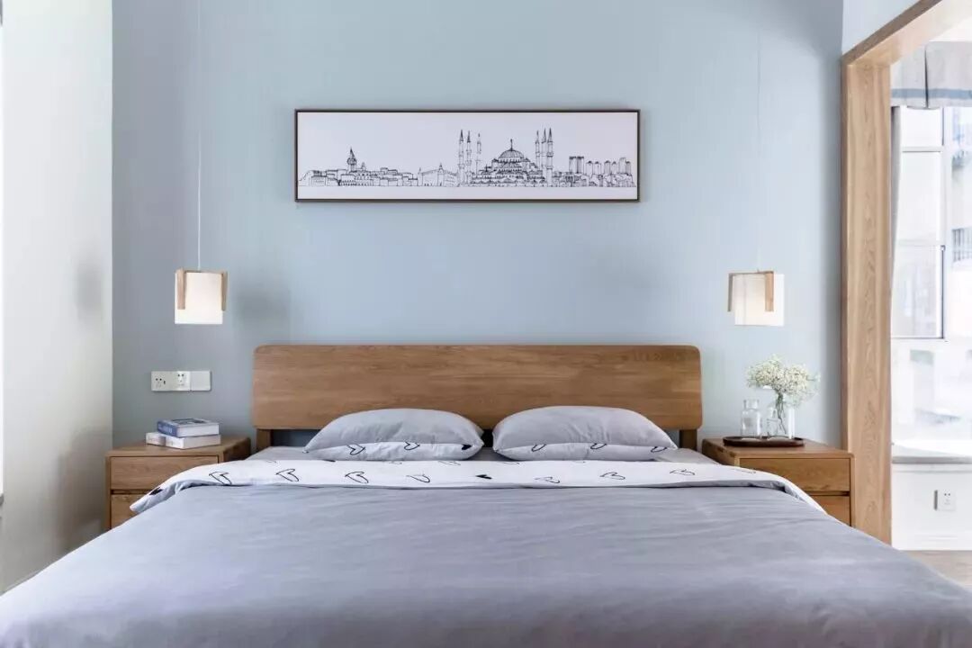 选用屋主喜欢的浅灰色床品,搭配床头的一点点蓝,宁静安逸。