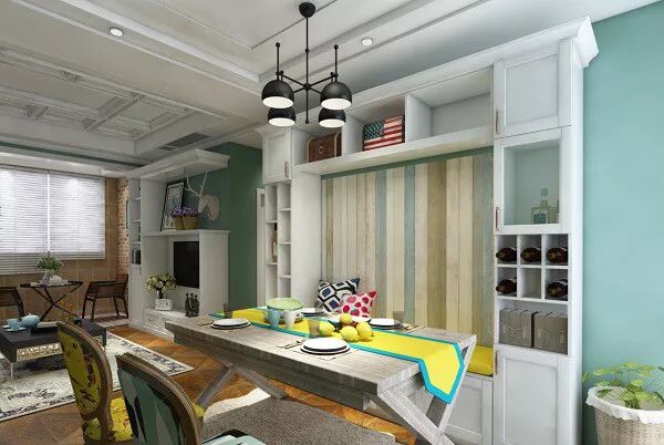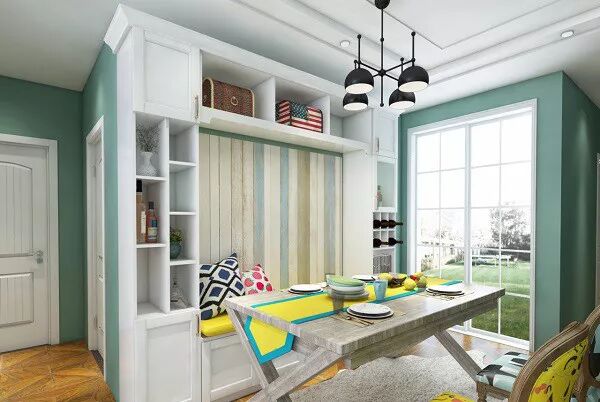 ▲白色与饱和色搭配,赋予空间轻快感。为保证充分的活动空间,餐厅靠墙设计卡座,可作为就餐时的椅子,简约实用,墙面倒正方形立柜,立体感骤显。