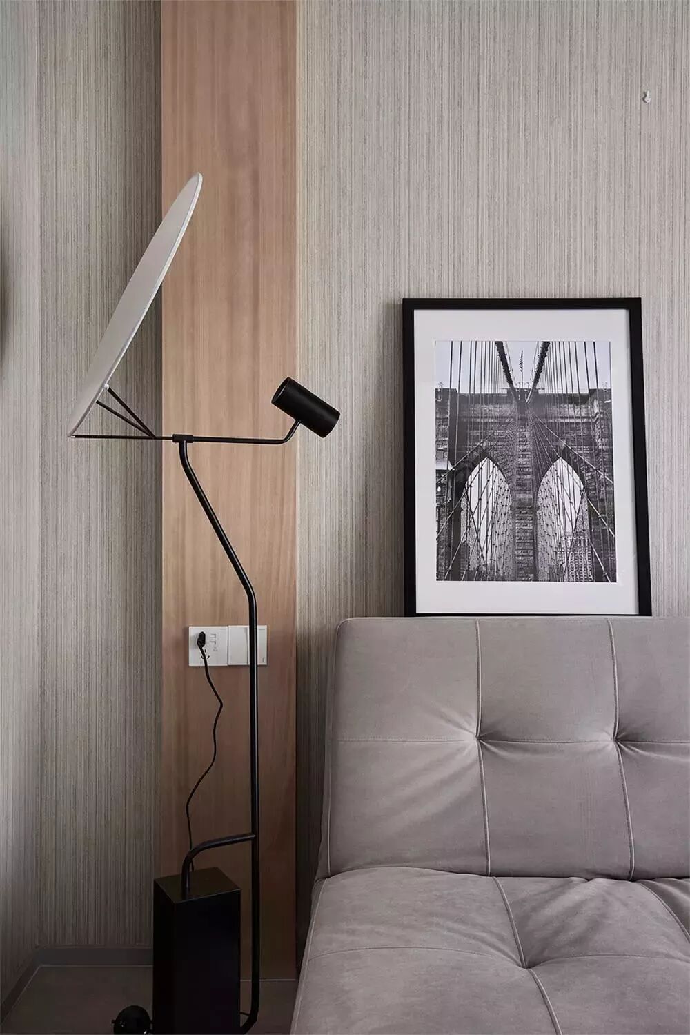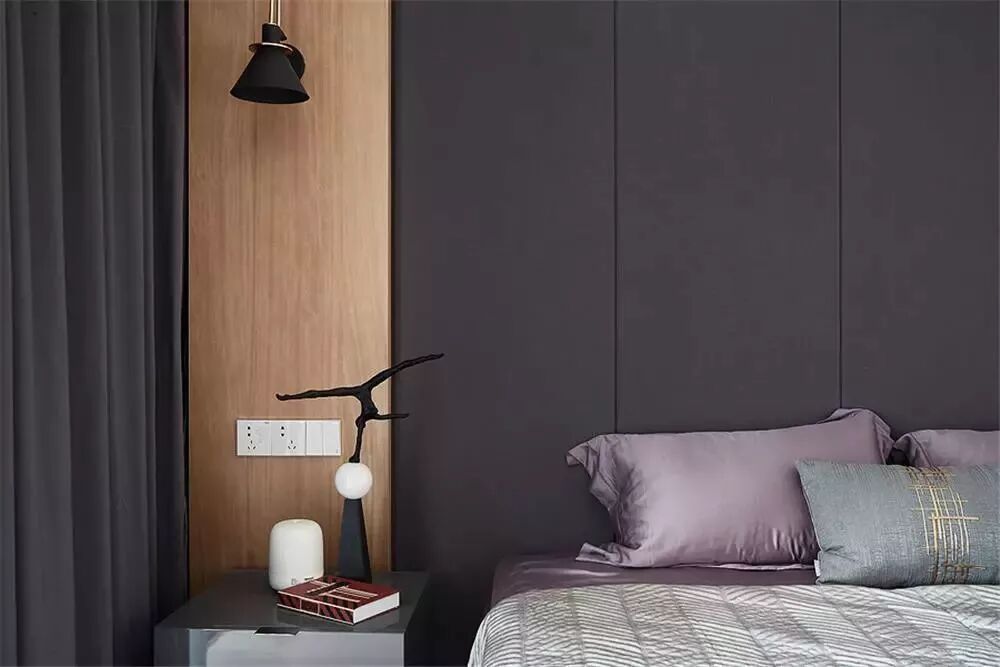 ▲卧室的床头背景墙以灰黑色+两侧木饰面,木质感的空间搭配侧边白色衣柜门,现代简约的空间在木色与暖光的衬托下,带来了温馨的氛围感。