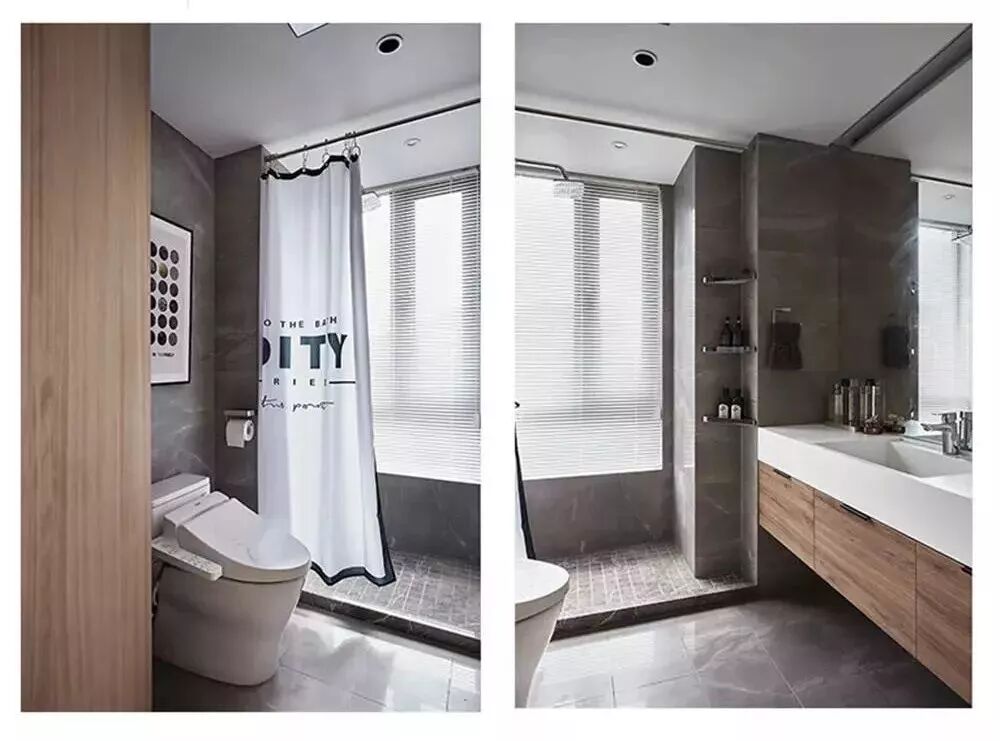▲卫生间整体灰色调的空间,以浴帘+挡水条的干湿分离,加上木色的洗手盆,带来了简简单单的自然。