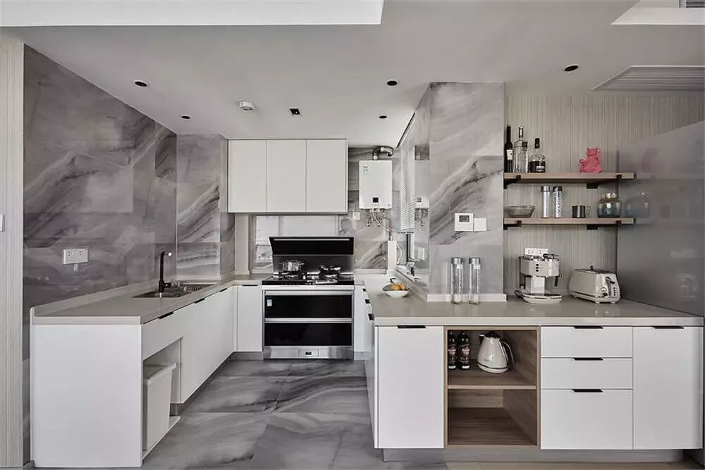 ▲灰色大理石质感的墙面、地面砖,搭配白色橱柜与黑色电器,带来了一个优雅自然的时尚黑白灰空间感。