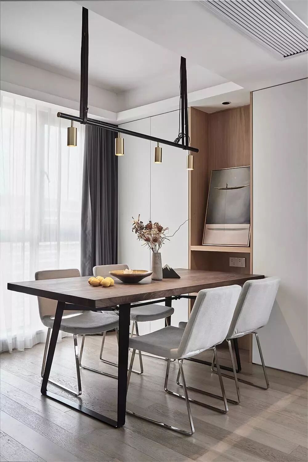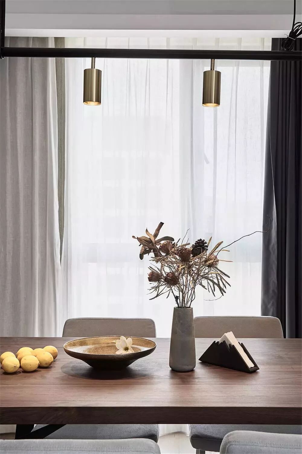 ▲铜色吊灯在黑色吊杆下,搭配餐桌上的摆饰,带来了一个独特端庄的用餐氛围。
