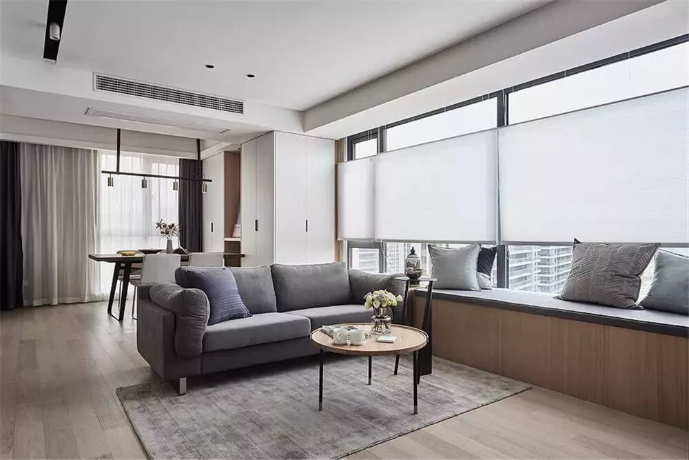 ▲靠窗做了一排的飘窗兼作客厅的桌椅与休闲功能,垫上灰色布艺的坐垫,整个客厅都给人以舒适的惬意。