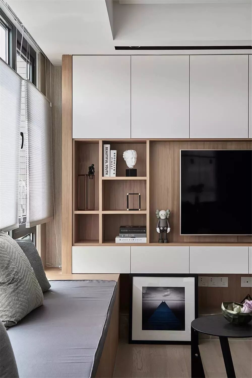 ▲电视墙纳入了收纳柜,在木饰面的木质感基础下,加入白色亚克力柜门,带来了一个简约自然的视觉感。