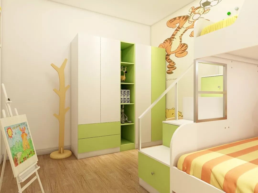 除了楼梯处抽屉+双开门收纳空间外,靠墙处还设计了衣柜,一白一绿,分区明显,孩子衣服也不会窜来窜去啦~