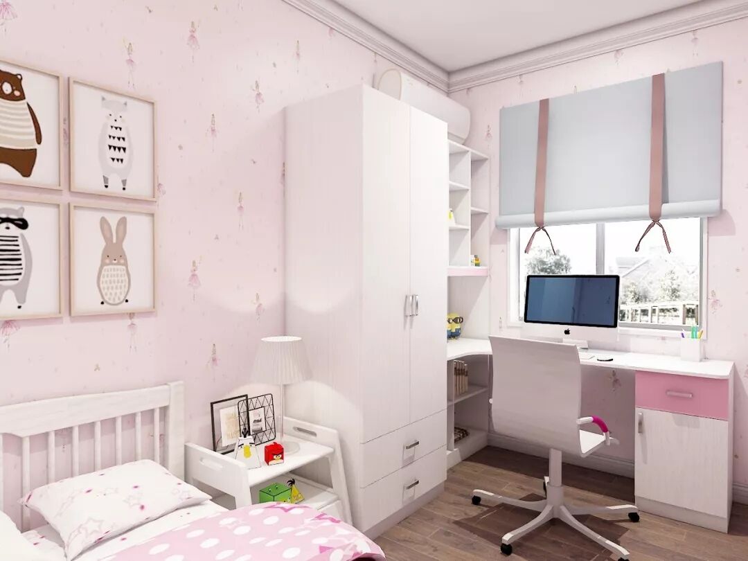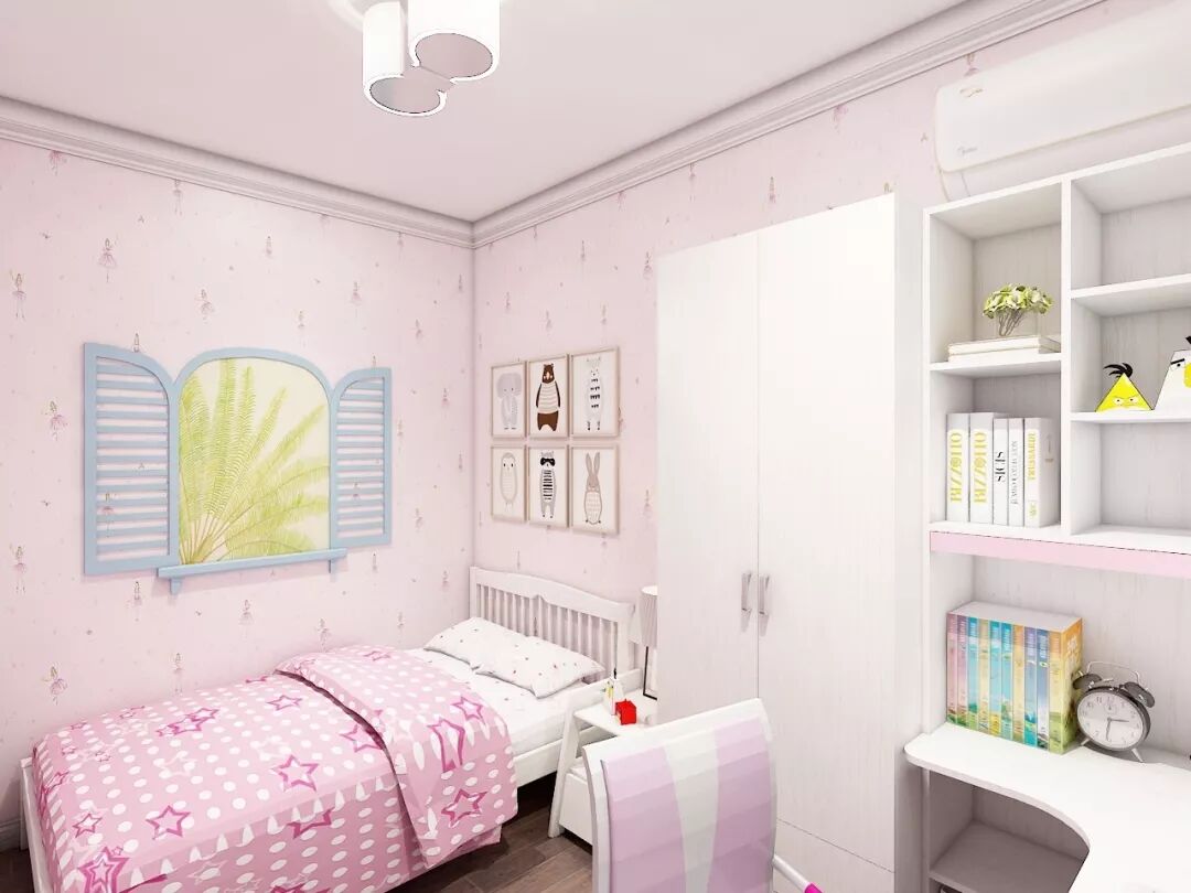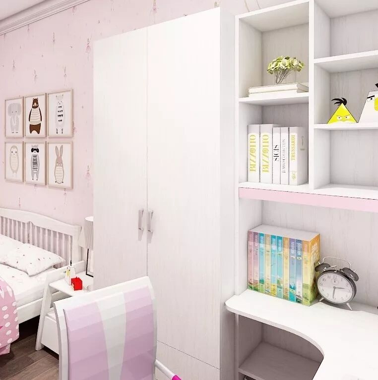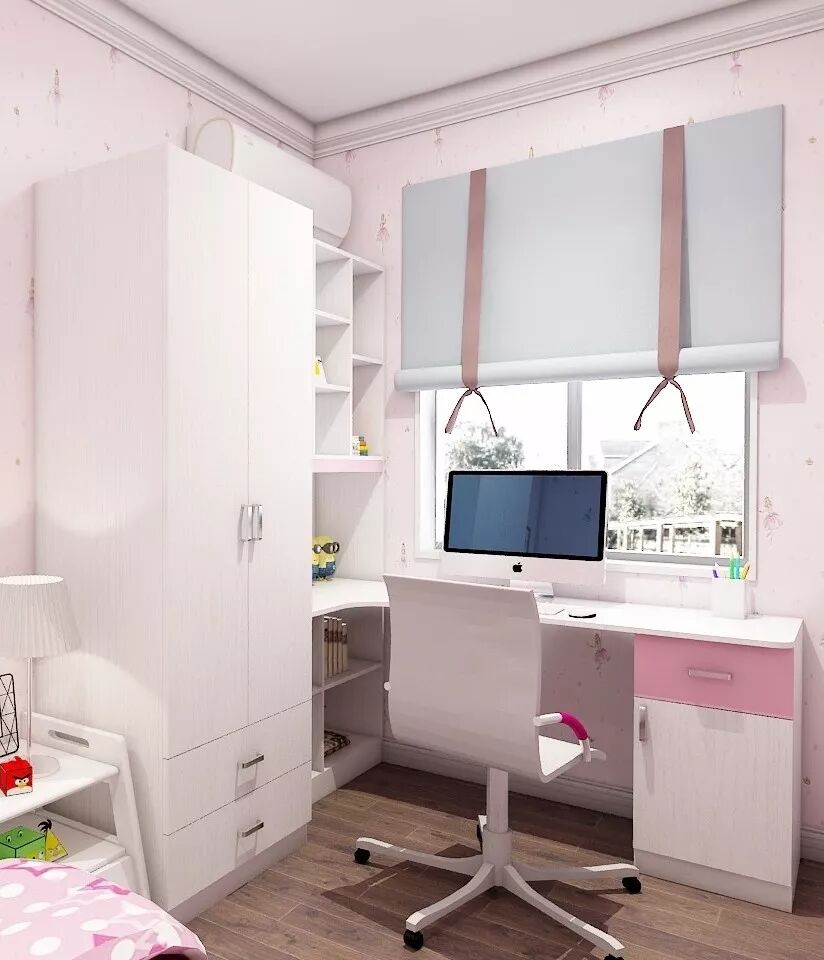 考虑到女儿房的空间小,设计师更多是考虑家具的收纳功能,主打能装能收,一体式定制,共用板材节以省空间。