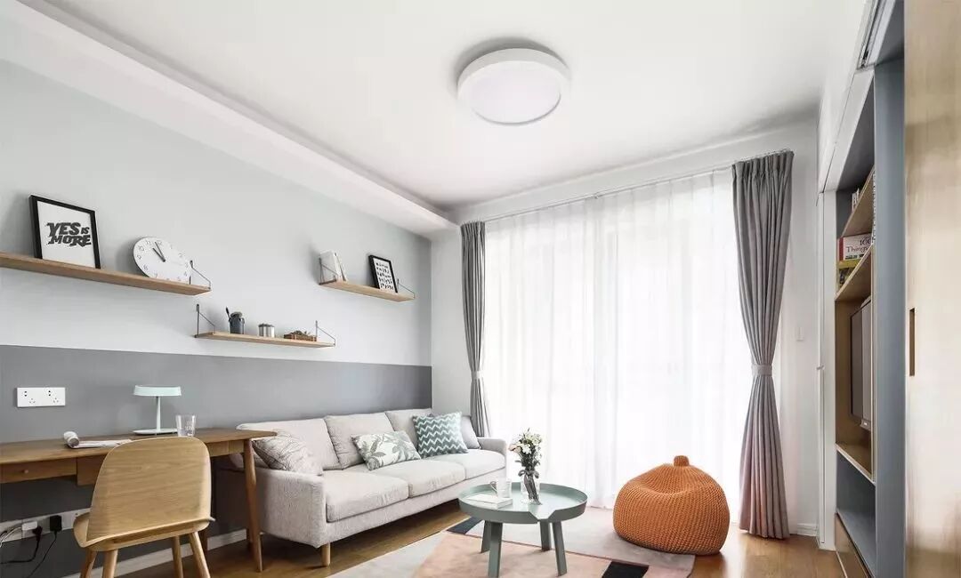 (60平米小户型的客厅拥有:客厅、餐厅、办公三种功能,麻雀虽小,五脏俱全。)