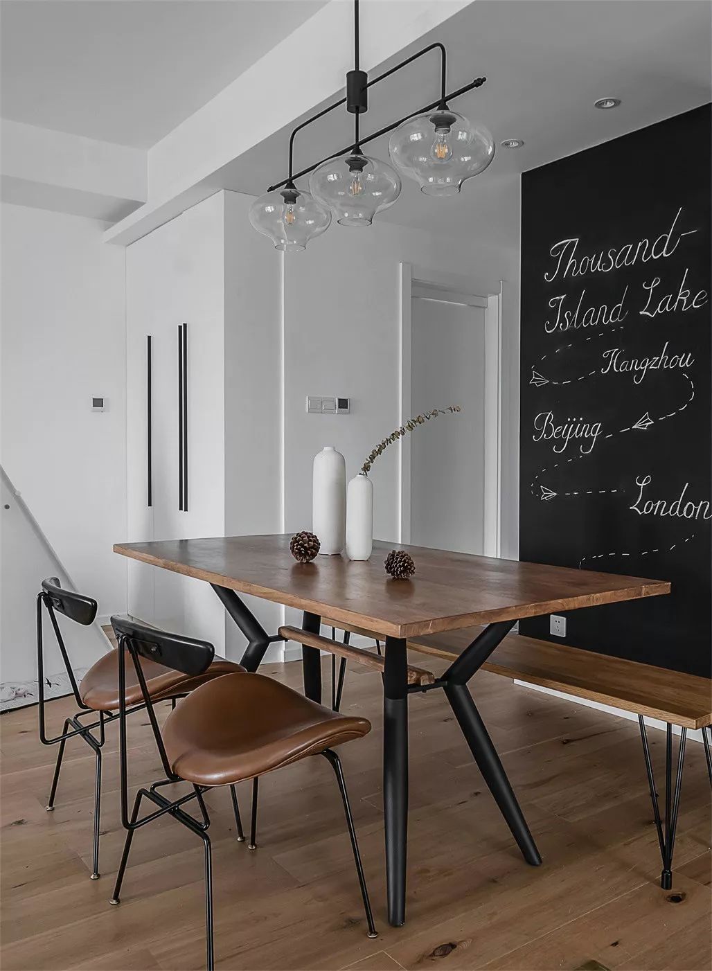 利用黑板漆在餐厅打造一面景观墙,墙面上制定了生活计划,不需要多么精美的画作就能让温馨感爆棚。工业风铁椅具有独特的美感,并且耐用,与条凳的组合碰撞出别具一格的火花。