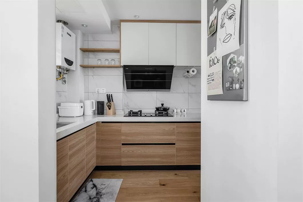 3、厨房是开放式的厨房,冰箱的位置是特意隔出来的,这样冰箱和灶台还有水池的区域就呈现了一个三角形的动线区域,在生活中使用起来也会很方便。