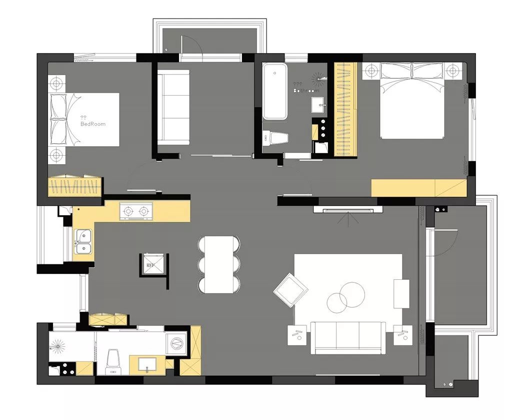 原户型是传统的三室两厅,本身不需要多少改动。玄关、厨房、餐厅、客厅做成开放式循环空间,有效利用空间的同时,动线更加合理。
