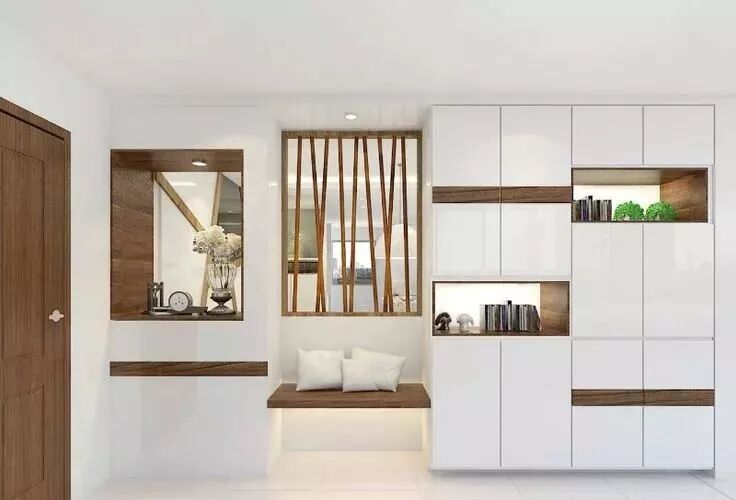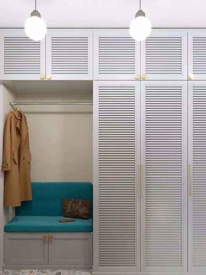 嵌入式壁柜是节省空间的利器,它的外观简约大气,内部收纳空间也很充足,可以设计成半开放+半封闭的形式,让换鞋凳和收纳区融为一体,整个门厅就不会显得又挤又乱了。