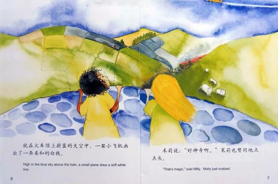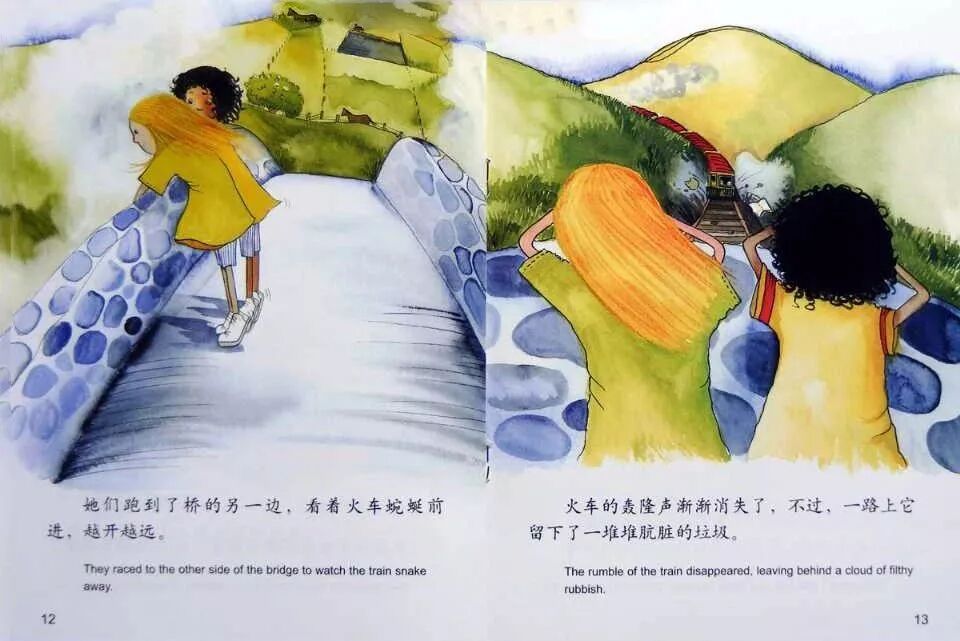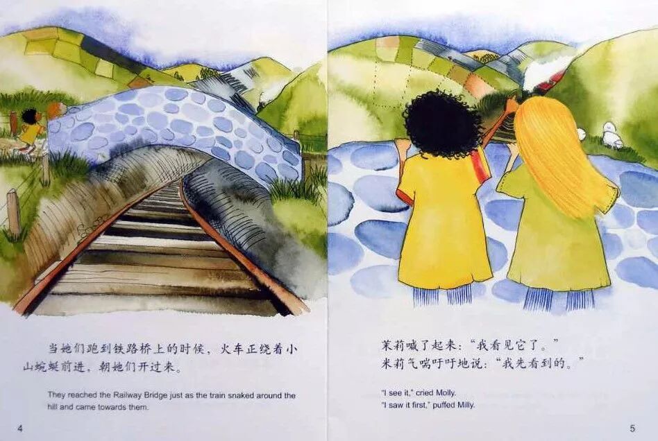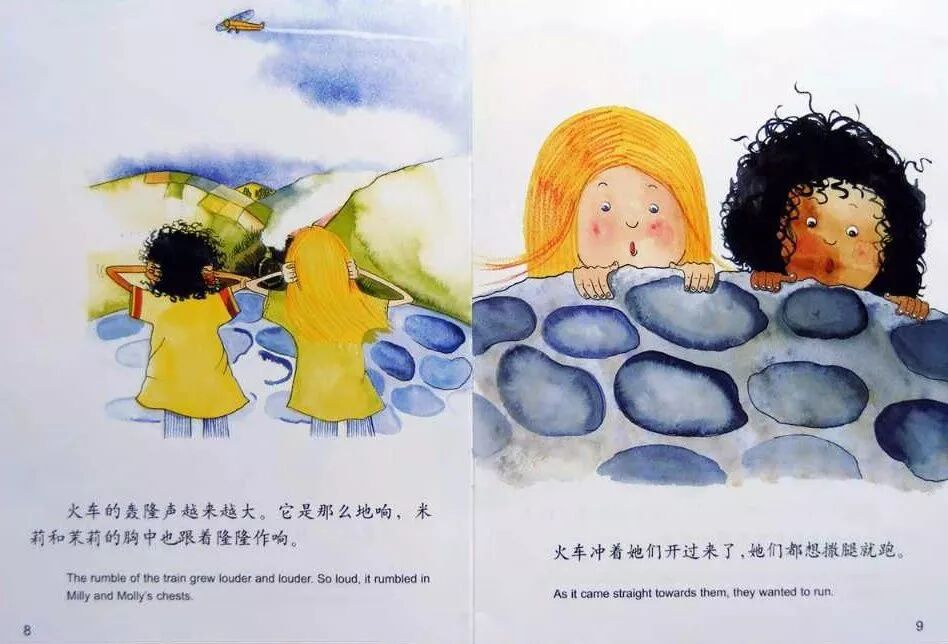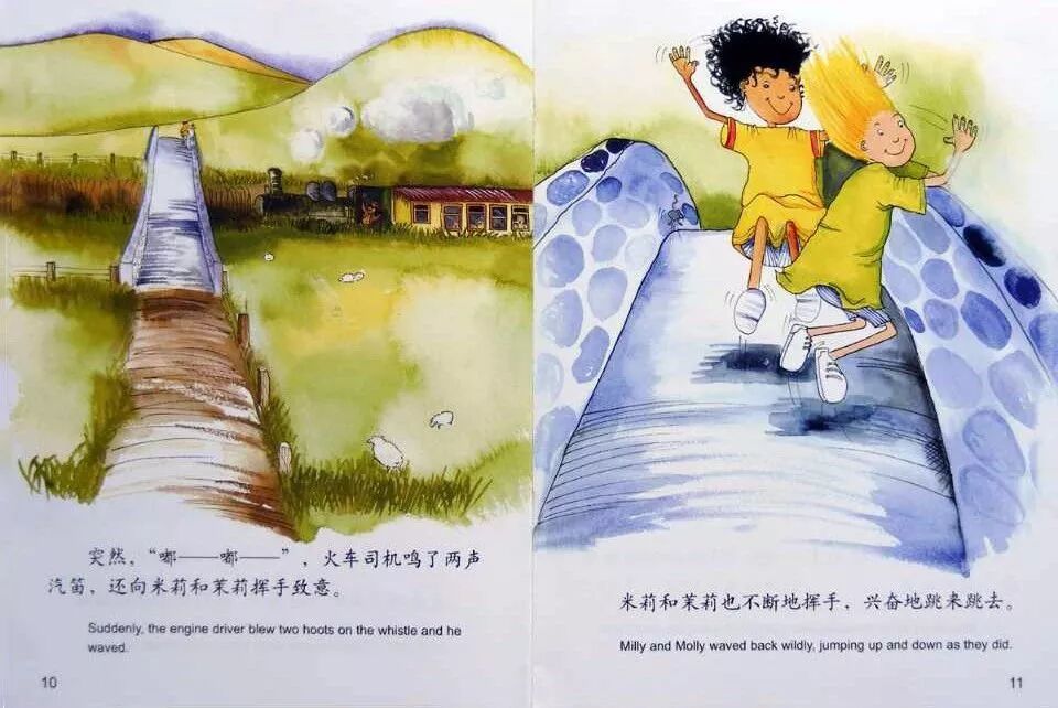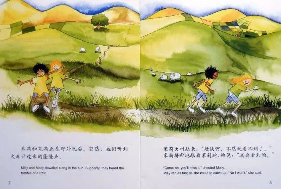 米莉和茉莉正在野外玩耍。突然,他们听到火车开过来的声音。她们赶忙朝着声音的方向跑去,想看一看这又高又大的火车。