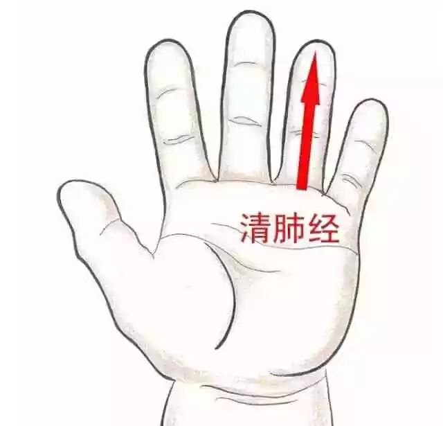 手法:推三关,食中二指并拢,自桡侧腕横纹起推至肘横纹处。