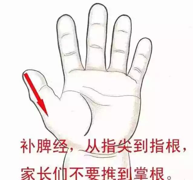 手法:用拇指指腹从孩子无名指根部向指尖方向直推。