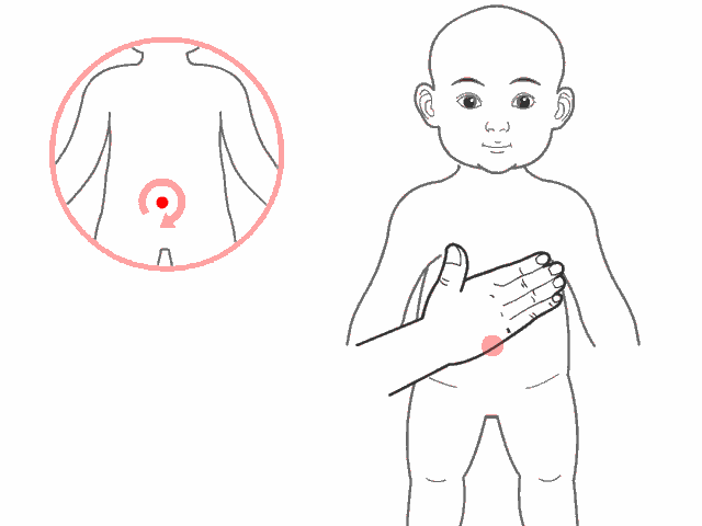 小儿推拿手法:以食、中、无名三指,揉动小儿肚脐直上方4寸位置之中脘穴,反复约30--50次。