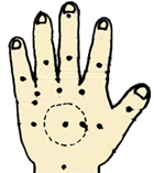 ∞ (揉)太阳:眉梢与外眼角之间向后约一横指的凹陷处,(一横指的意思是:指一“食指”的宽度,也就是食指的直径长度)即太阳穴。用双手中指罗纹面用力或双手大拇指罗纹面用力,从下向前再向上往后揉圈运动为补法。