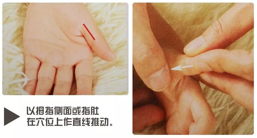 手法:推法,以拇指侧面或指肚,在穴位上做直线推动。