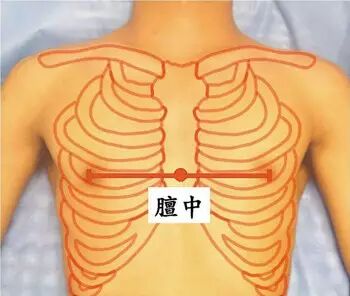 膻中穴位于人体的胸部人体正中线上,两乳头之间连线的中点。
