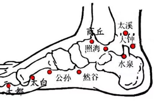 比如说「肾足少阴之脉,起于小指之下」,「邪走足心,出于然谷之下,循内踝之后」。其实在内踝这一个区域,分布着大钟穴、太溪穴、水泉穴、照海穴这几个重要的穴位。