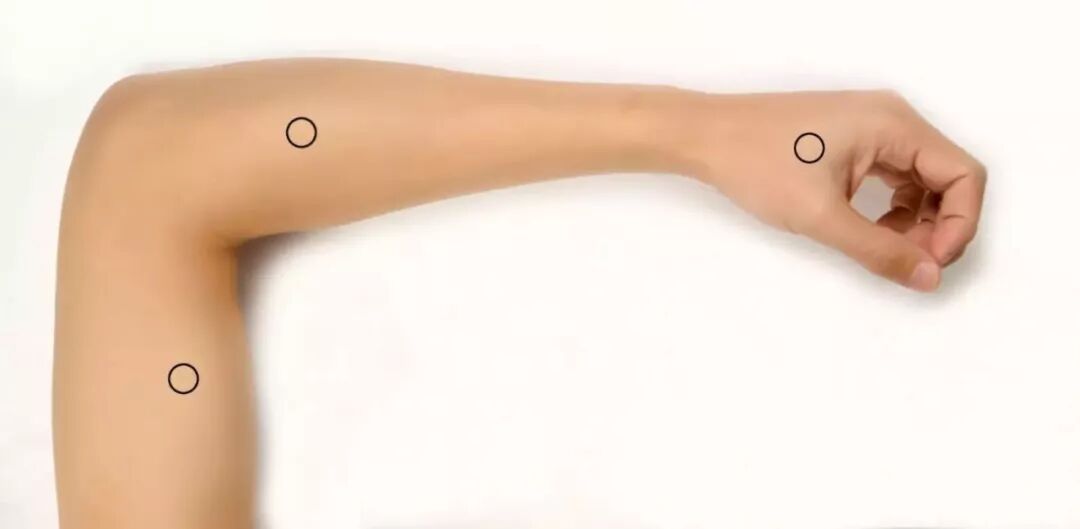沿着这条线,手臂立起来,从肘关节敲击到腕关节,你在敲击的时候首先发力的角度是垂直的,力距不要超过三厘米,发力稍微重一点不怕,重要的是角度一定是垂直的。多数朋友在敲击三遍以后,在肘关节下方三指宽的地方会有疼痛明显的感觉,这个穴位叫手三里,它的疼痛意味着现在有经络的堵塞。