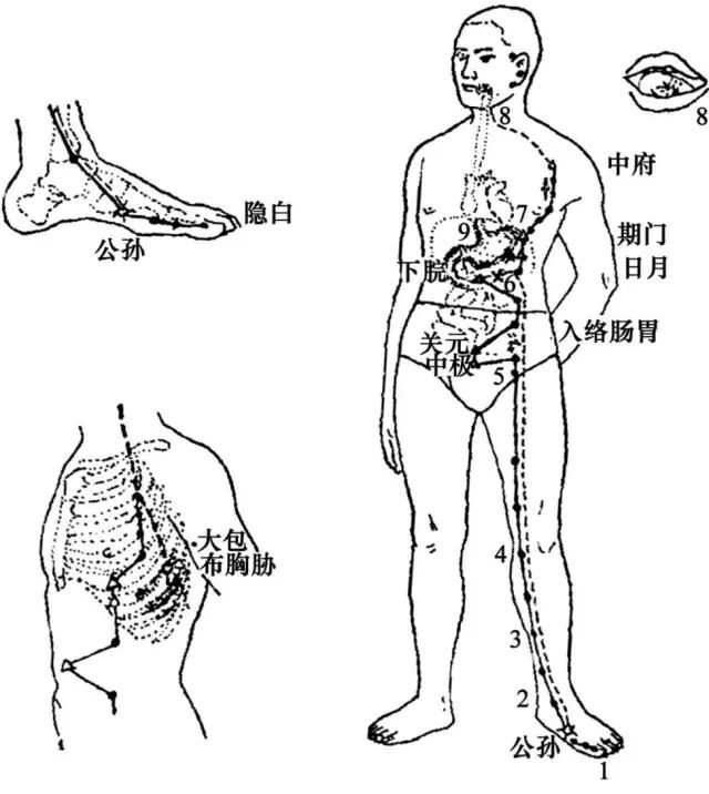 脾足太阴之脉,起于大指之端,循指内侧白肉际,过核骨后,上内踝前廉,上踹内,循胫骨后,交出厥阴之前,上循膝股内前廉,入腹,属脾,络胃,上膈,挟咽,连舌本,散舌下。其支者,复从胃,别上膈,注心中。——《黄帝内经·灵枢·经脉》