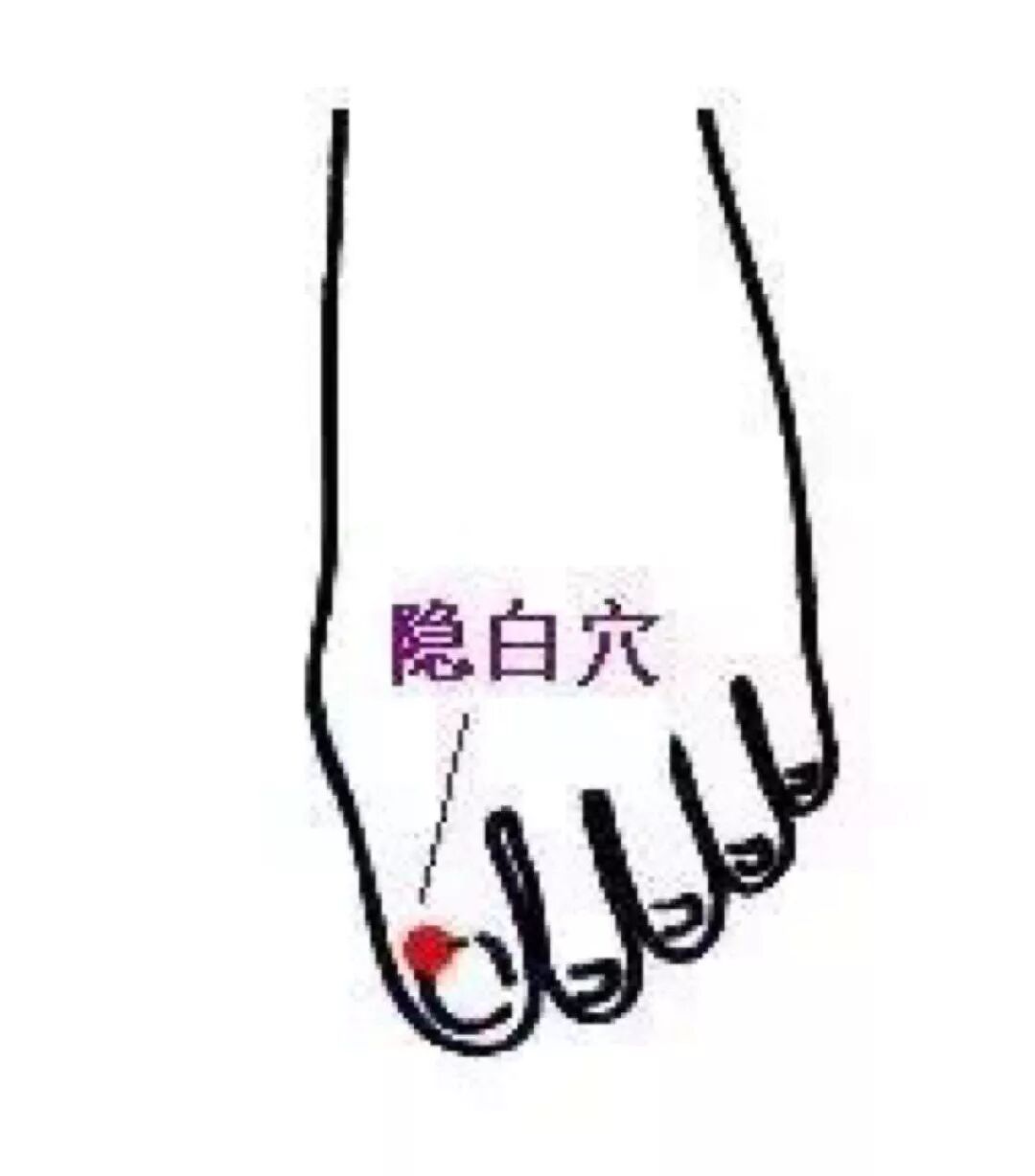 隐白穴首先定位是脚,以大脚趾指甲盖的边缘做一条横线,然后以指甲盖的内测做一条竖线,横线跟竖线交叉点。用你拇指的指尖的位置,点在这个位置,揉或者按压,或者借助于家里面的棉签按压,每次五分钟。脾虚,睡觉容易流口水的朋友,也要常按压这个穴位。