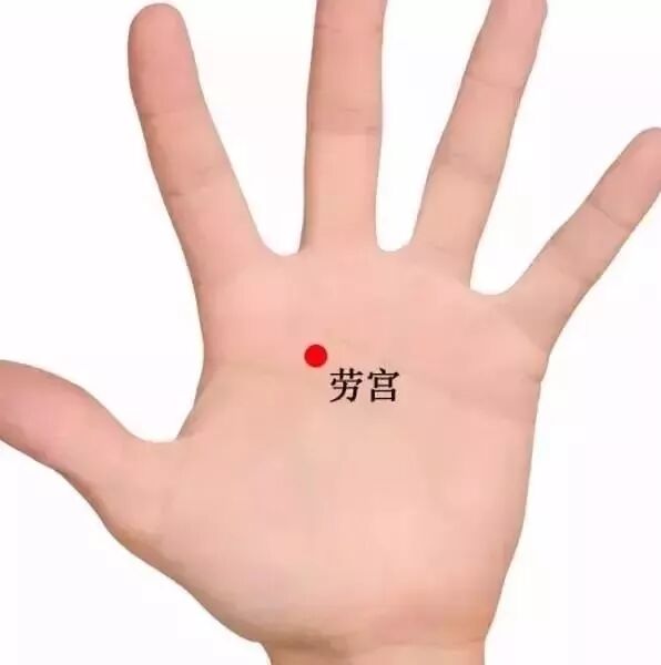 4、手心:即劳宫穴,偏于第3掌骨,握拳屈指时中指尖处。