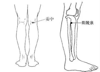 1.点揉委中穴,敲揉合阳穴(委中穴直下3横指处)。