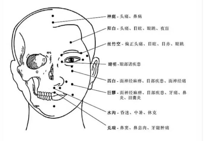 头部上方及面部穴位主要有神庭穴、阳白穴、丝竹空穴、睛明穴、四白穴、巨髎穴、水沟穴、兑端穴、上星穴、攒竹穴、瞳子髎穴、承泣穴、迎香穴、禾髎穴、地仓穴、承浆穴16个。