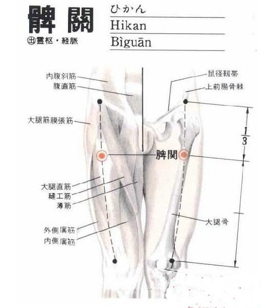 位置:在大腿前面,当髂前上棘与髌底外侧端的连线上,屈髋时,平会阴,居缝匠肌外侧凹陷处。