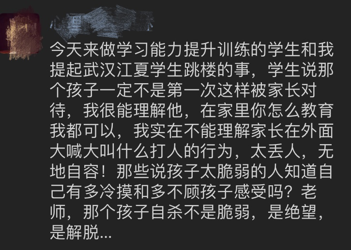 9月17日,武汉市江夏一中一名九年级的孩子,因玩扑克牌被班主任请家长,在学校里被其母亲当众扇耳光后跳楼自杀,虽然已经尽快送医,但是因为伤势过重还是抢救无效死亡。