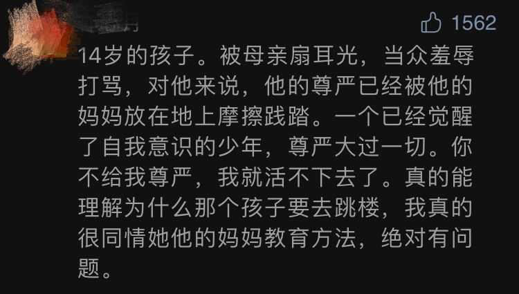 看着这么一个比妈妈高出半头的大男孩,被妈妈打,既没有还手也没有顶嘴,默默咽下屈辱一跃而下,我真的说不出“孩子太脆弱”这样的话。