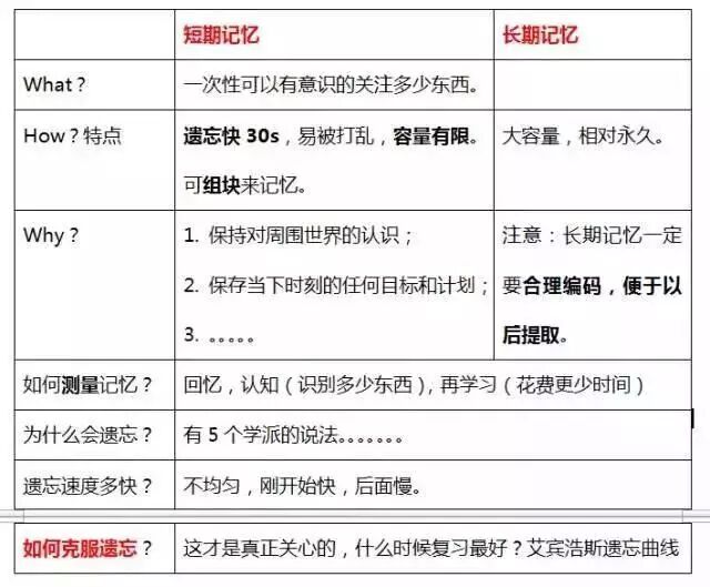 短期记忆和长期记忆可以直接理解,一个时间短一个时间长。我们最希望使用的是长期记忆,最需要克服的就是遗忘,然而艾宾浩斯遗忘曲线复习时间间隔非常短,还是比较推荐《如何学习》这本书中提到的复习时间间隔。
