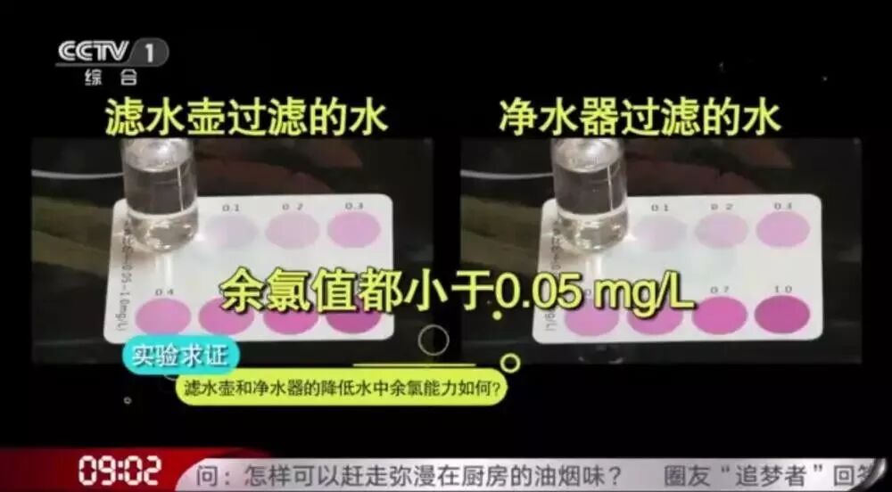 检测人员通过利用余氯测纸和色卡对比颜色,分别对三类水进行了余氯测试。测试发现: 用滤水壶和净水器过滤后的水余氯值都小于0.05mg/L,自来水余氯值为0.1mg/L。