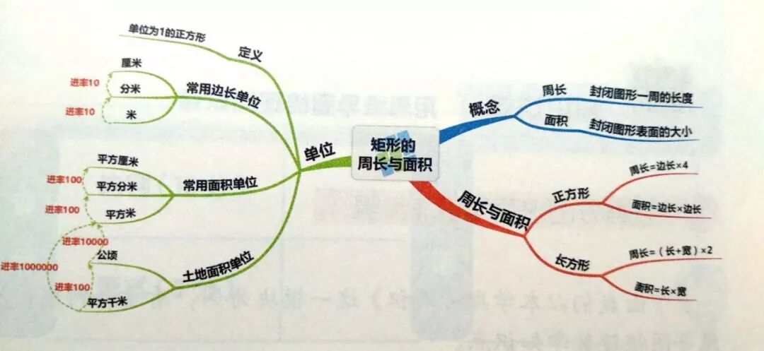 比如,关于“矩形的周长与面积”有很多知识点,要把他们之间的逻辑关系理清楚要讲半天,但我们这样用思维导图一整理,立马就清晰了。