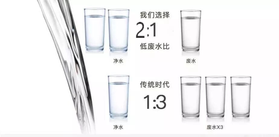 “废水比”就是经过RO膜制出来的纯水与所产生的废水的数值比,目前市面上RO膜净水器的废水比一般有1:1,1.5:1,2:1,3:1,前面的数字越大,就意味着这款净水器越节能环保,排放的废水就越少。