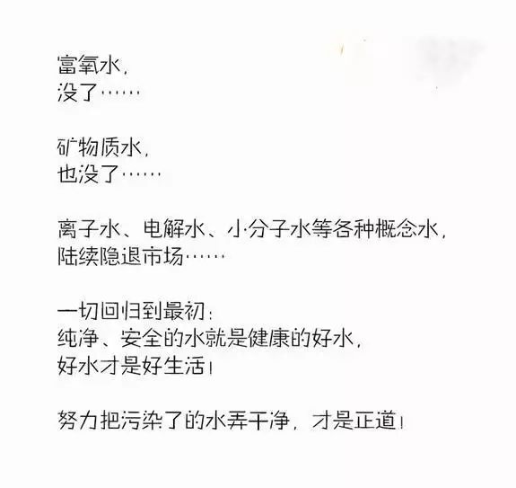 大家请看:娃哈哈富氧水,没了。康师傅饮用矿物质水,也没了。蒸馏水、冰川水、离子水、小分子水、功能水等等各种概念水,统统退出市场。各种骗人的把戏落幕了!