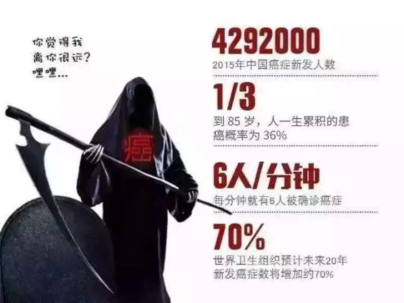 数据显示:中国每分钟有6人被确诊为癌症,每天就是8640人,一年就是315万多。这是一个可怕的数据。