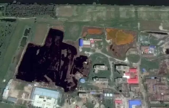 在廊坊市大成县南赵扶镇北部,有一个废水坑面积约15万平方米,约相当于21个足球场地。渗坑内的水呈铬黄色、红色,并有大量沉积黑色污泥。