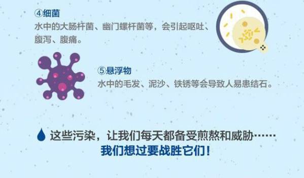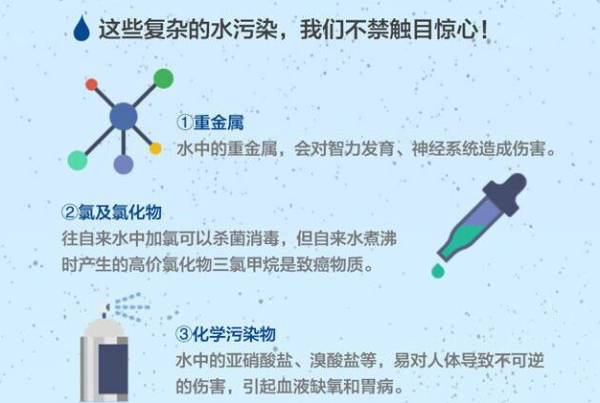 自来水中明矾、铁锈、 余氯、三卤甲烷、重金属铅、汞以及细菌病毒, 也就是煮沸也无法去除, 据WHO报道,世界水体中可检查出2221种化学物质,其中饮水中有害有机污染物765种,经鉴定确认其中致癌物20种, 可疑致癌物23种, 致突变物56种, 促癌剂18种。