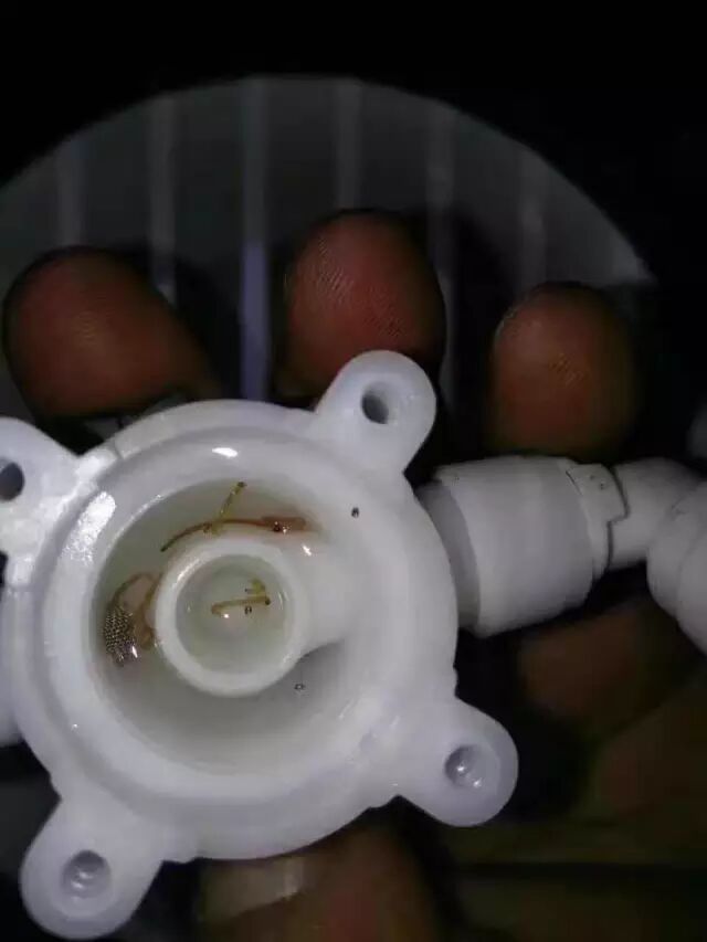 太可怕了!还是我比较幸运!净水机的要紧部件~进水电磁阀被红线虫堵死了,还动呢。如果沒净水机,做饭,泡茶,洗菜以后进入身体,那伤害可大了。可上网搜一下这小东西的伤害力。
