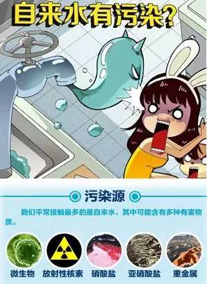 自来水中明矾、铁锈、 余氯、三卤甲烷、重金属铅、汞以及细菌病毒, 也就是煮沸也无法去除, 据WHO报道,世界水体中可检查出2221种化学物质,其中饮水中有害有机污染物765种,经鉴定确认其中致癌物20种, 可疑致癌物23种, 致突变物56种, 促癌剂18种。