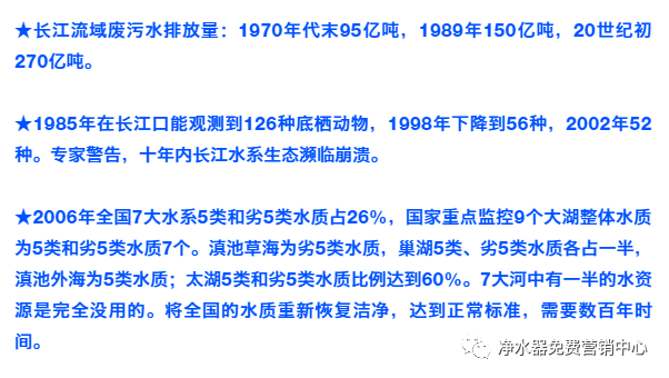 全国532条河流,有82%受到不同程度的污染。全国约有7亿人口饮用大肠杆菌超标水,约有1.7亿人饮用受有机物污染的水。