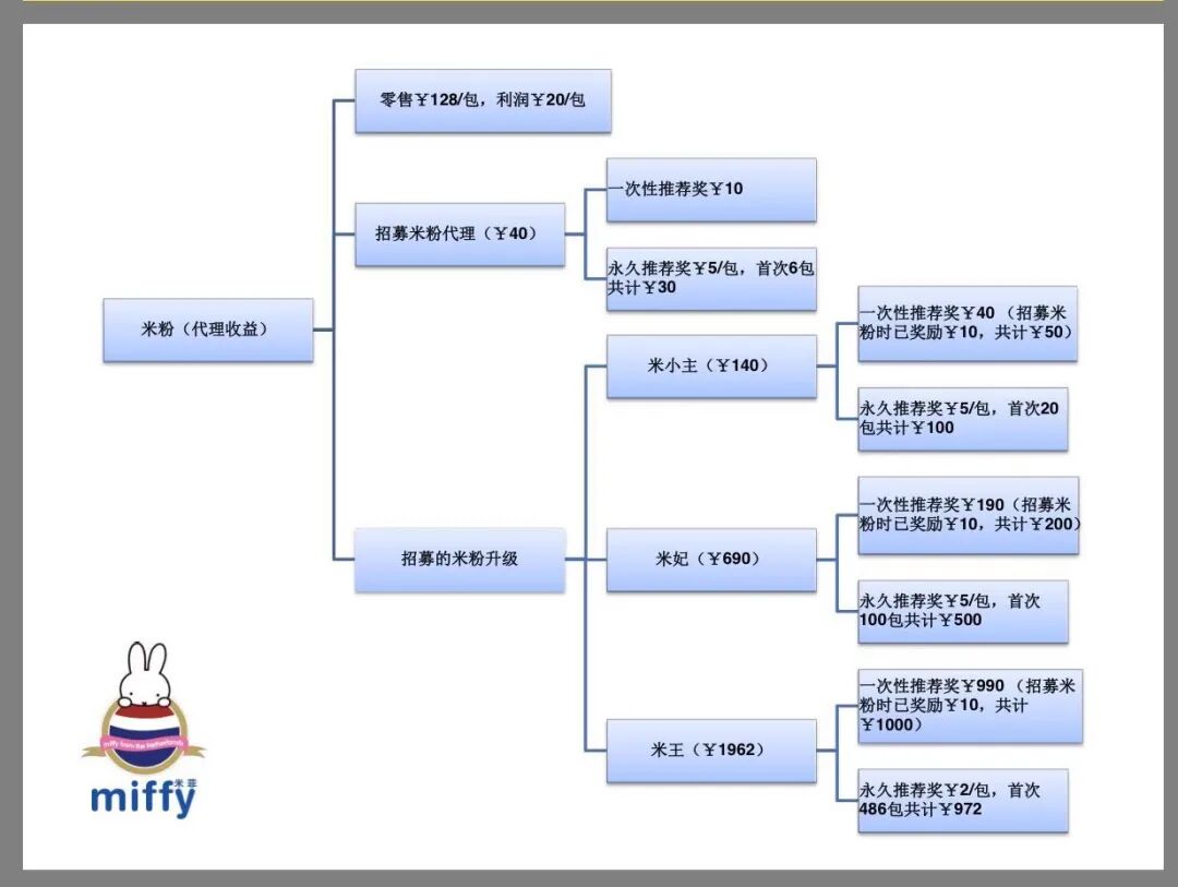 2、米粉也可以招代理,米粉招一个米粉,赚15元。而且可以无限制的招下去,相当于自己用又省了。而且米粉享受长期推荐奖,只要你招到的米粉补货,你都会拿5元一包的奖励。