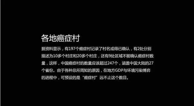 这就是癌症,不声不响的让一些村变成了癌症村;我们只知道有名的华西村、天津大邱庄