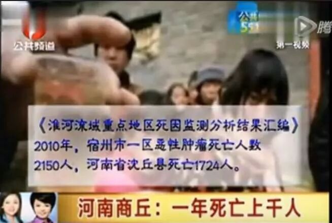 坐落在淮河的支流沙颍河畔的河南省沈丘市境内多处村庄,由于河流环境污染,癌症高发。黄孟营村42岁的王来成,因患脊髓炎瘫痪在床,为维持家里的开支和治病,老婆去安徽打工,为给儿子补充营养,母亲赵玉英到街上的小餐馆要些剩骨头渣,回来给孩子熬汤。家里的几亩地由父亲代为照料。