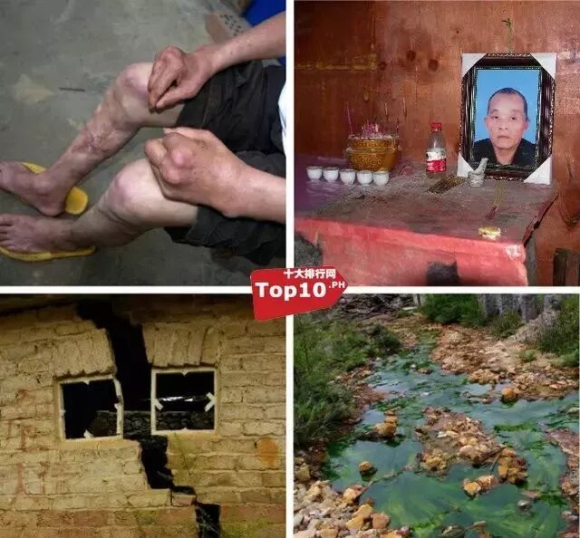 广西大新县五山乡三合村常屯,是中国著名的十大“癌症村”之一。59岁的村民黄富强的双臂长满了大小不一的疙瘩,手的骨骼也已严重弯曲、变形,不能正常伸展。广西职业病防治研究院2001年3月对常屯46位村民的检验报告单。报告显示,黄富强的尿镉指标为4.29微克每升。因村里地下被锌矿挖空,房子墙体开裂,空洞的窗户仿佛一个人在哭泣,矿山边的溪流绿得吓人。